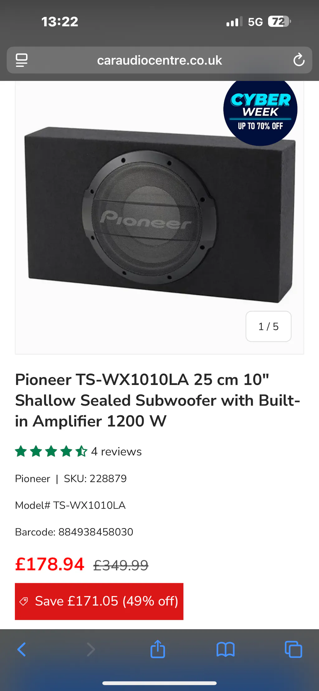 Pioneer TS-WX1010LA 25 cm 10" Shallow Sealed Subwoofer with Built-in Amplifier 1200 W